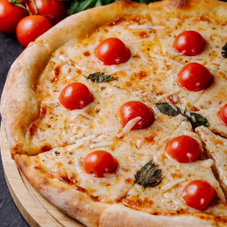 Pizza con pomodorini, aglio nero e mozzarella di bufala