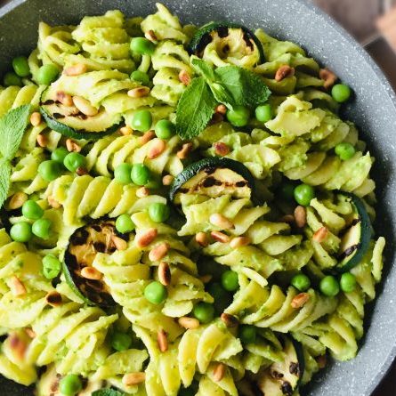 Pasta con pesto di aglio nero, zucchine e pomodorini