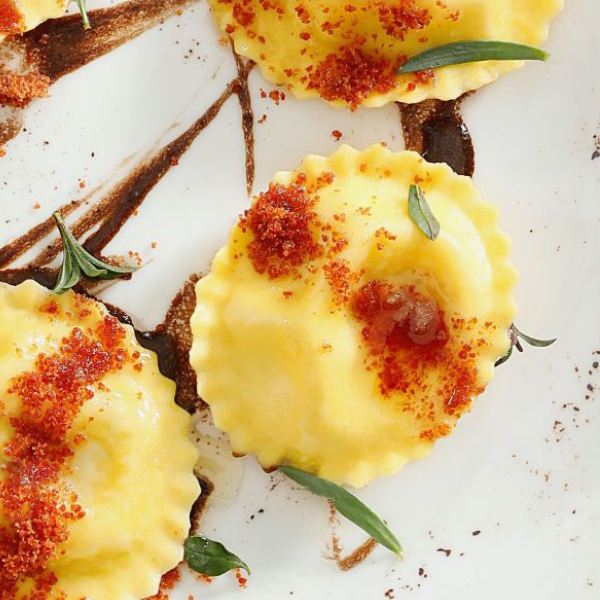Ravioli con asiago e funghi in salsa di aglio nero gourmet