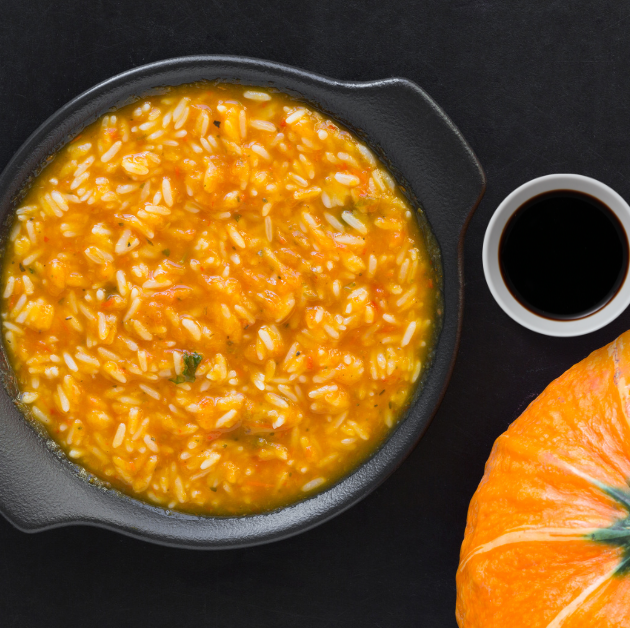 Risotto con salsa di aglio nero, gorgonzola e noci